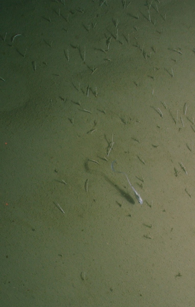 Kaikōura Canyon seabed showing a dense bed of tubed forams and a rattail fish. In February a NIWA survey showed nothing existed here after the November earthquake.