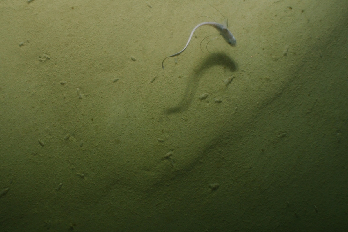 Juvenile sea cucumbers and a rattail fish on the seafloor of the Kaikōura canyon – a sign of recovery.