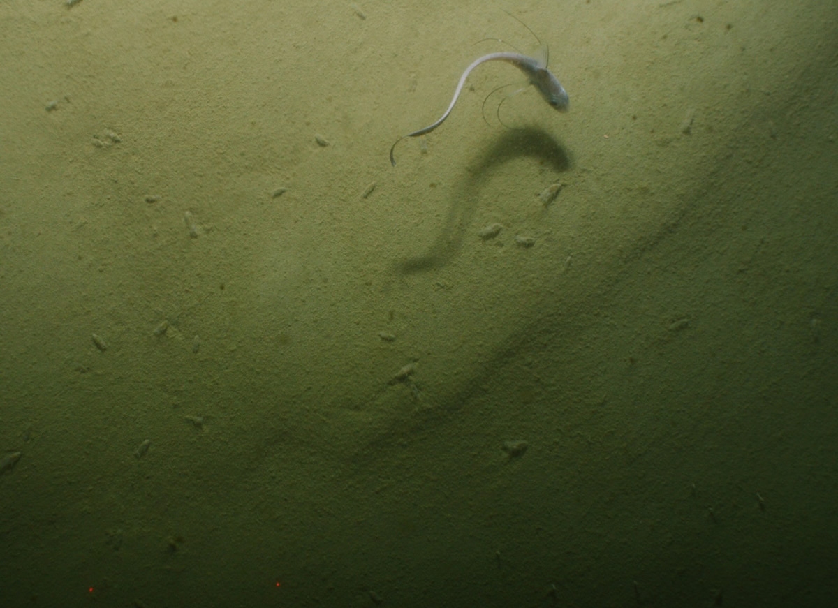 Juvenile sea cucumbers and a rattail fish on the seafloor of the Kaikōura canyon – a sign of recovery.