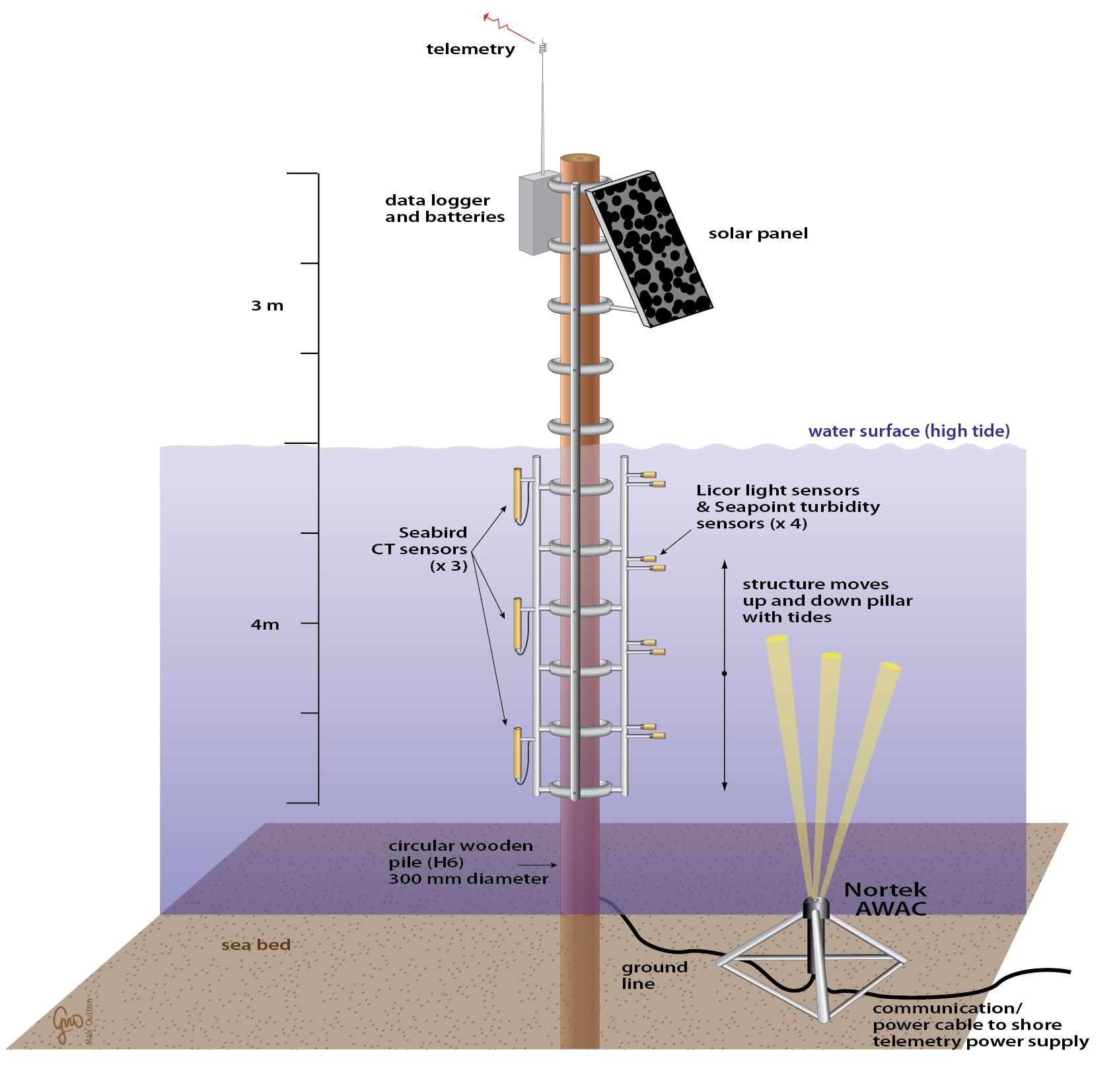 Figure 5: Kaipara Harbour instrument platforms – this is one of several designs currently being evaluated for long-term measurements of estuarine water-column properties controlling estuarine water clarity dynamics.