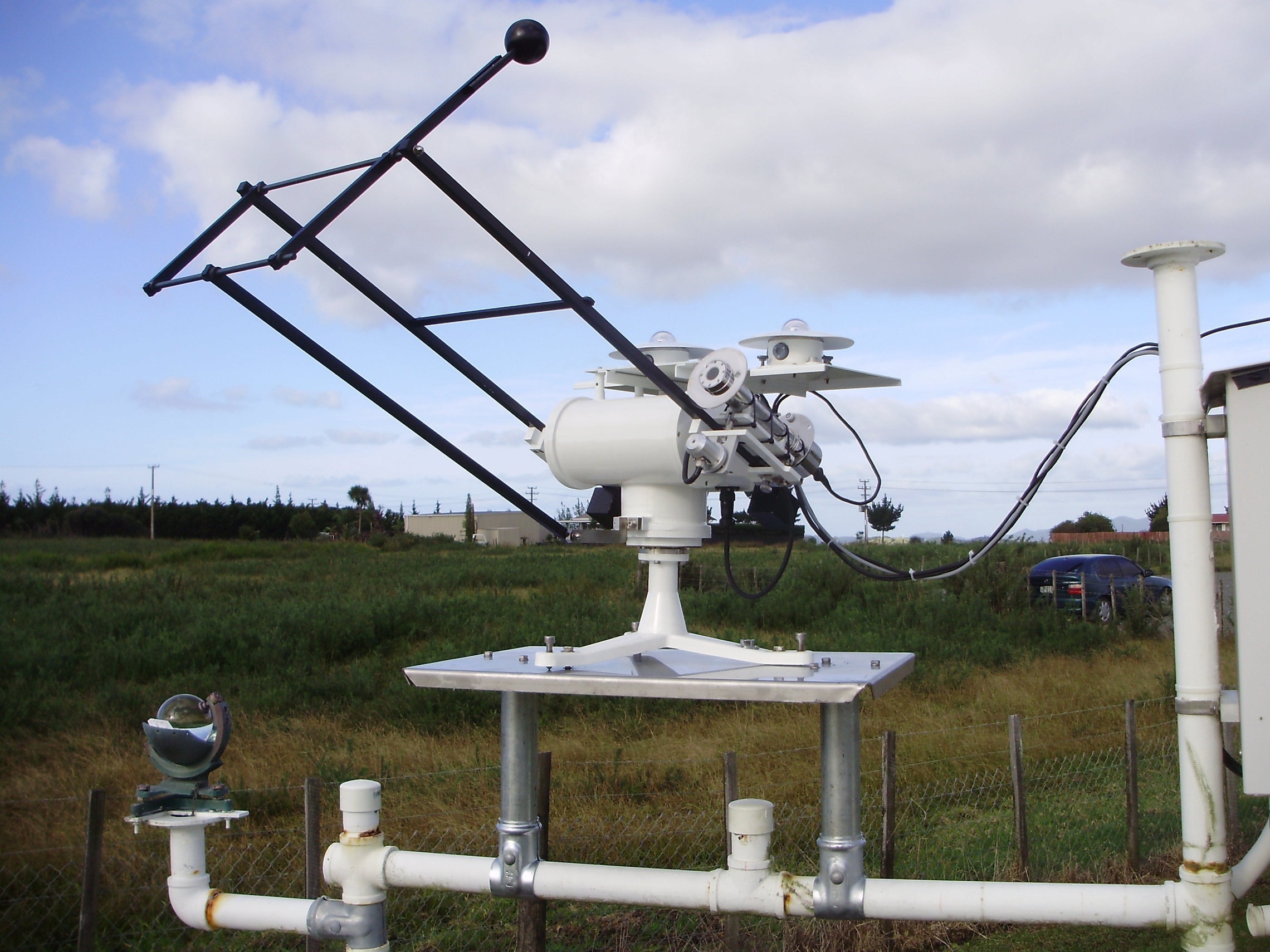 Instruments on the new Kaitaia solar tracker follow the sun as it moves across the sky. The black sphere shades the diffuse sensor (pyranometer) from the sun’s direct radiation whereas the long tubular sensor (pyrheliometer) ‘looks’ directly at the sun. An older-style “Campbell-Stokes” sunshine recorder is in the left foreground Photo: Bob Newland