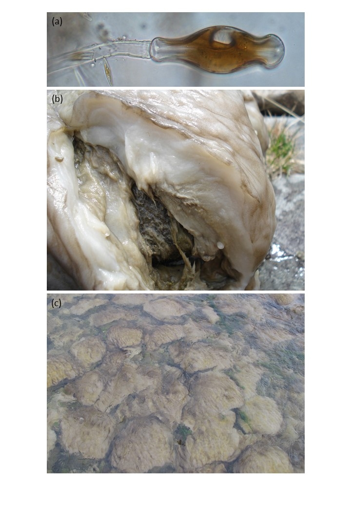 Photos showing Didymo in all its guises. a) Cell of Didymosphenia geminata, with stalk (cell approx. 130 μm long). (b) D. geminata mat cut open to show the thick mass of white stalk material with a thin layer of cells at the surface. (c) High cover of a riverbed by D. geminata mats.