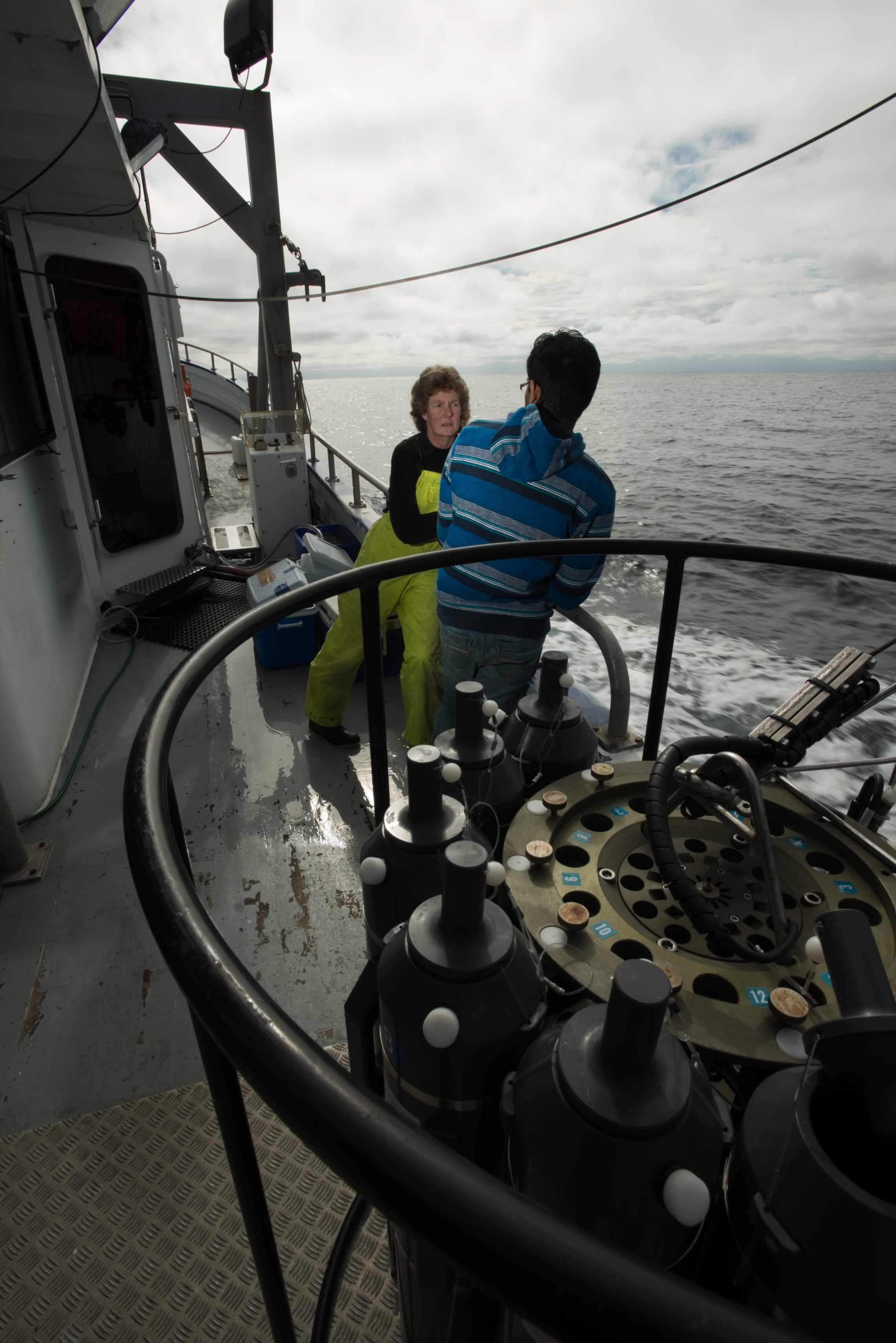Kim Currie (left) and Nayeem Mullungal on RV Polaris. Photo taken by Dave Allen on 15 November 2012.