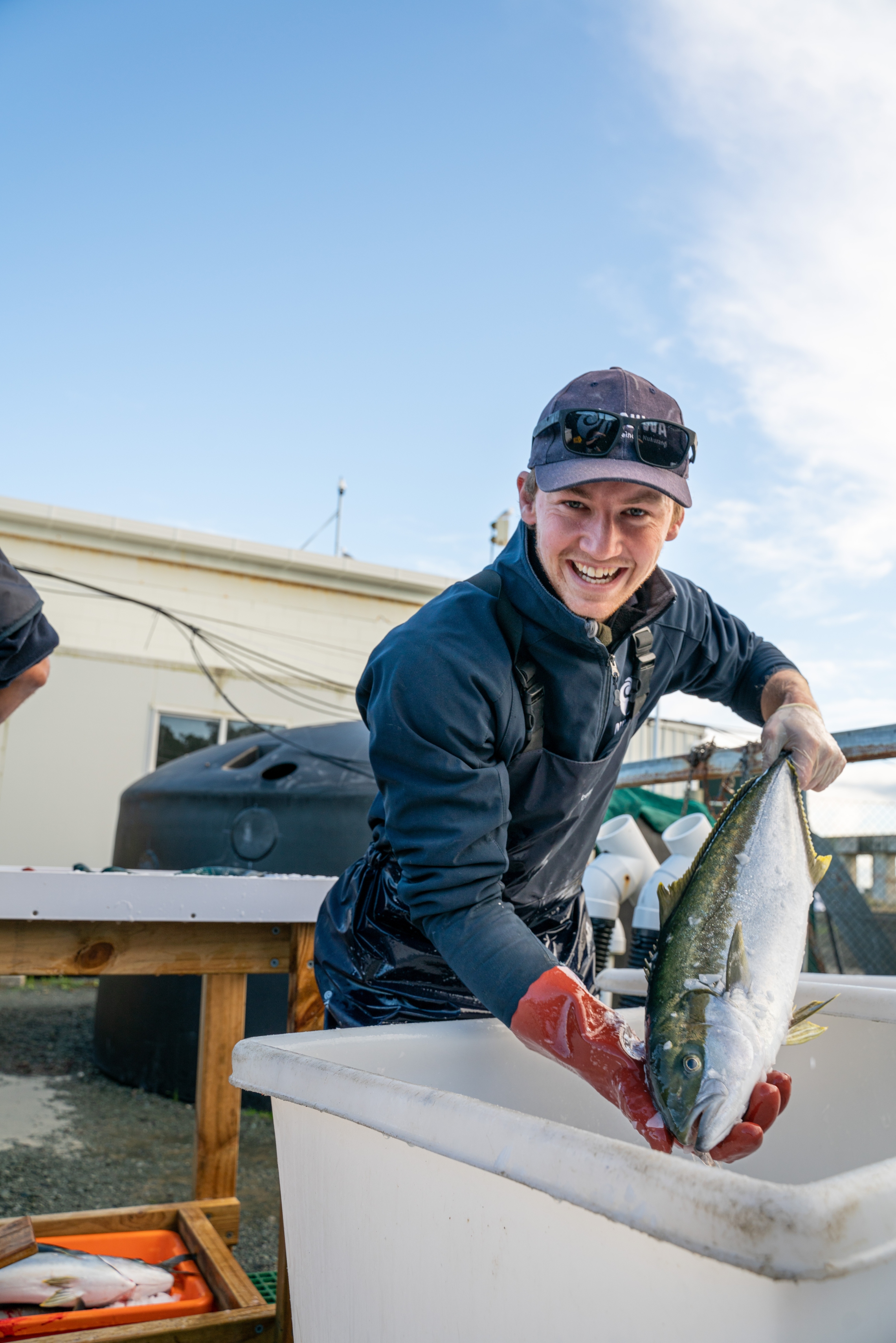 Aquaculture technician Michael Exton packs a freshly-harvested 4kg Ruakaka Kingfish in ice, ready for dispatch to the chef.