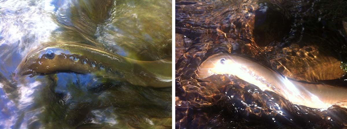 A lamprey using its round sucker-like mouth to pull itself along rocks on the bottom of the river in order to move upstream. Most lamprey move at night but some (like this male) are out and about during the day.