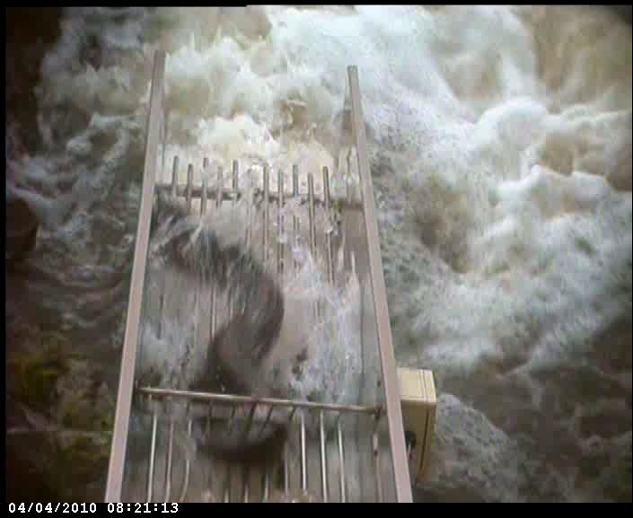 A large migrant eel exits the bypass onto stainless steel chute at Wairere Falls Power Station. This photo is provided by the remote camera system that records the passage of migrant eels through the chute. Credit: King Country Energy and NIWA