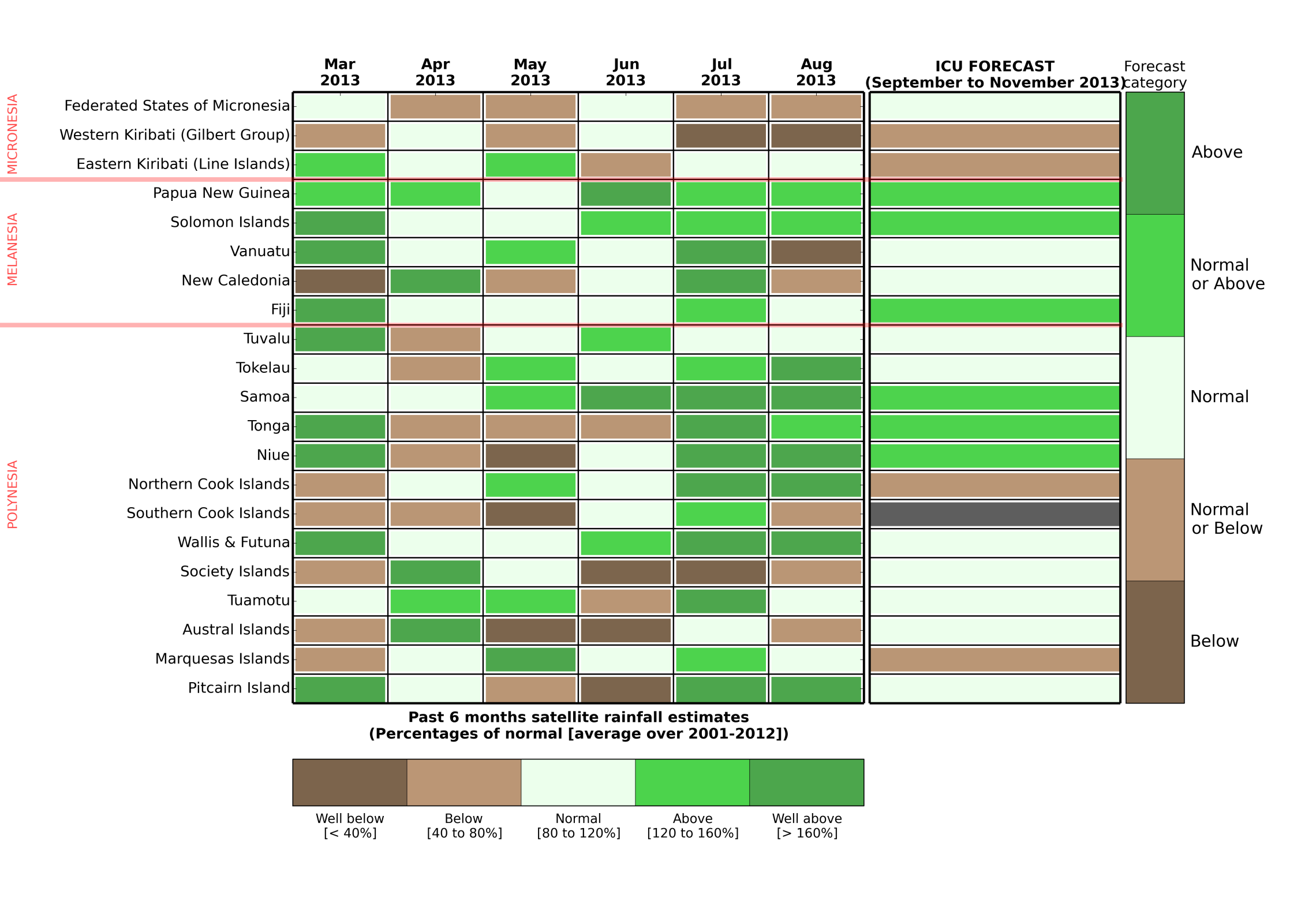 The last six months rainfall anomalies for each Island group alongside the latest ICU rainfall forecast for the September-November 2013 period.