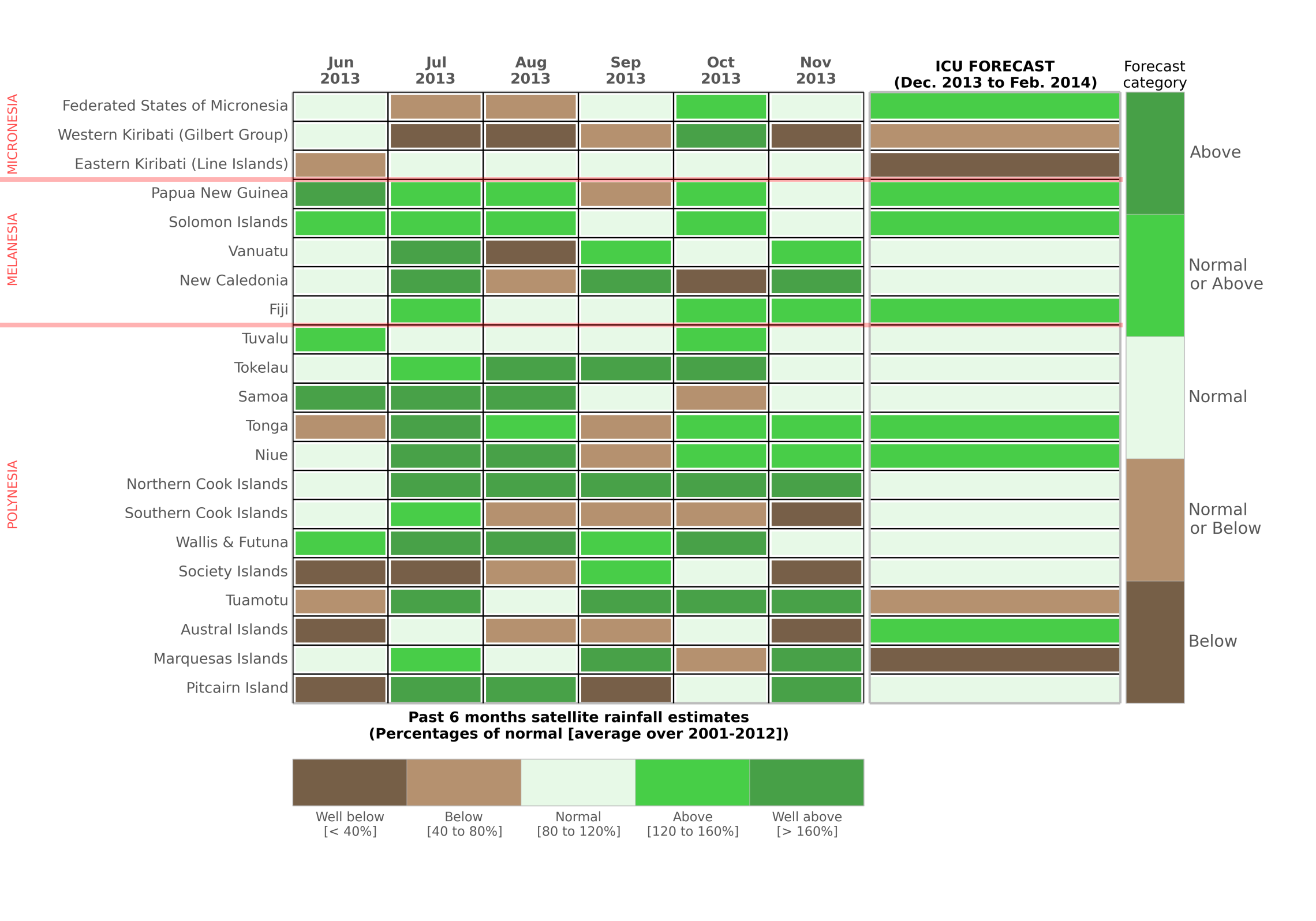The last six months rainfall anomalies for each Island group alongside the latest ICU rainfall forecast for the December 2013 - February 2014 period.