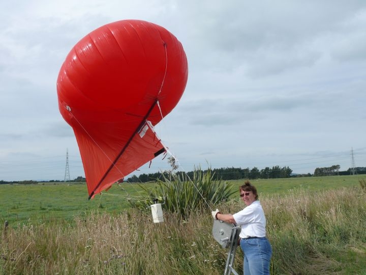 Sally Gray deploys the helikyte near power transmission lines. The wind and temperature data from its vertical-profiling instruments is downloaded via a wireless link.
