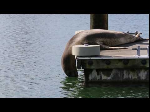 Leopard seal (Hydrurga leptonyx) resting at Marsden Cove Marina.