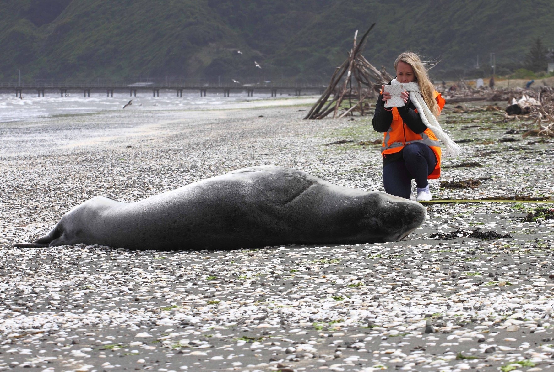 Leopard seal resting at Owhira Bay, Wellington. NIWA Cetacean Biologist/Ecologist Dr Krista Hupman has helped getting leopard seals a new residential status in New Zealand waters.