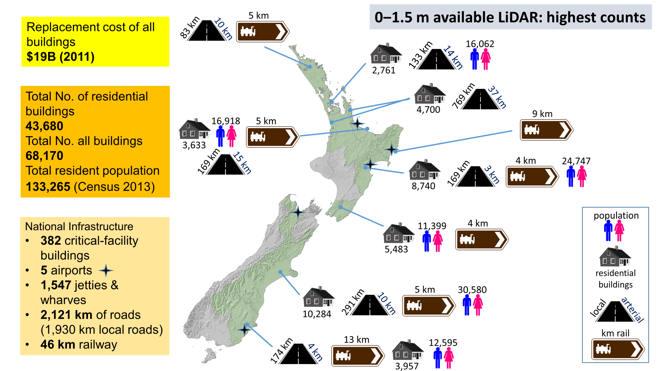 Levels of coastal risk exposure, in terms of resident population, buildings, roads, railway, airports and jetties/wharves for land elevations below 1.5 m above MHWS at the coast. Results on the left have been aggregated from regional totals for regions where LiDAR data was available.
