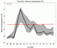 The likely daily minimum temperature at Tara Hills, 5 to 19 July. The red line indicates the historical average minimum temperature for the period.