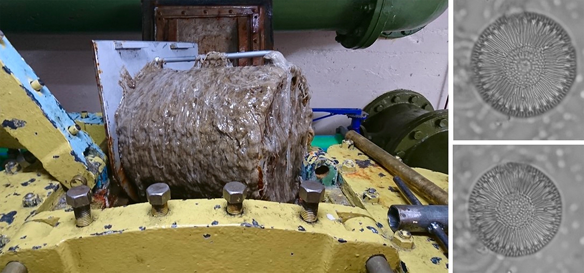Lindavia intermedia slime on equipment from power station intake. Right: Cleaned cells of Lindavia intermedia under light microscopy. Cells are from 15 to 35 µm in diameter.