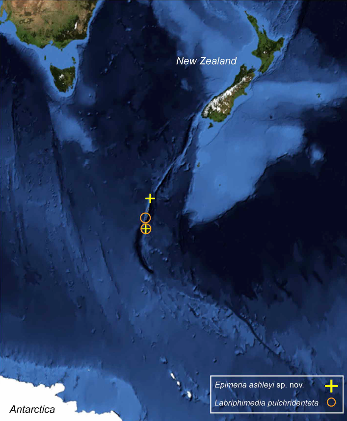 This map shows the locality of the seamount where the 2008 specimens of Labriphimedia pulchridentata were rediscovered (red circles), along with new species Epimeria ashleyi (yellow plus) (Figure 1 reproduced from Lörz, 2012). Image credit: Figure 1 reproduced from Lörz, 2012, Zootaxa 3200: 49–60.