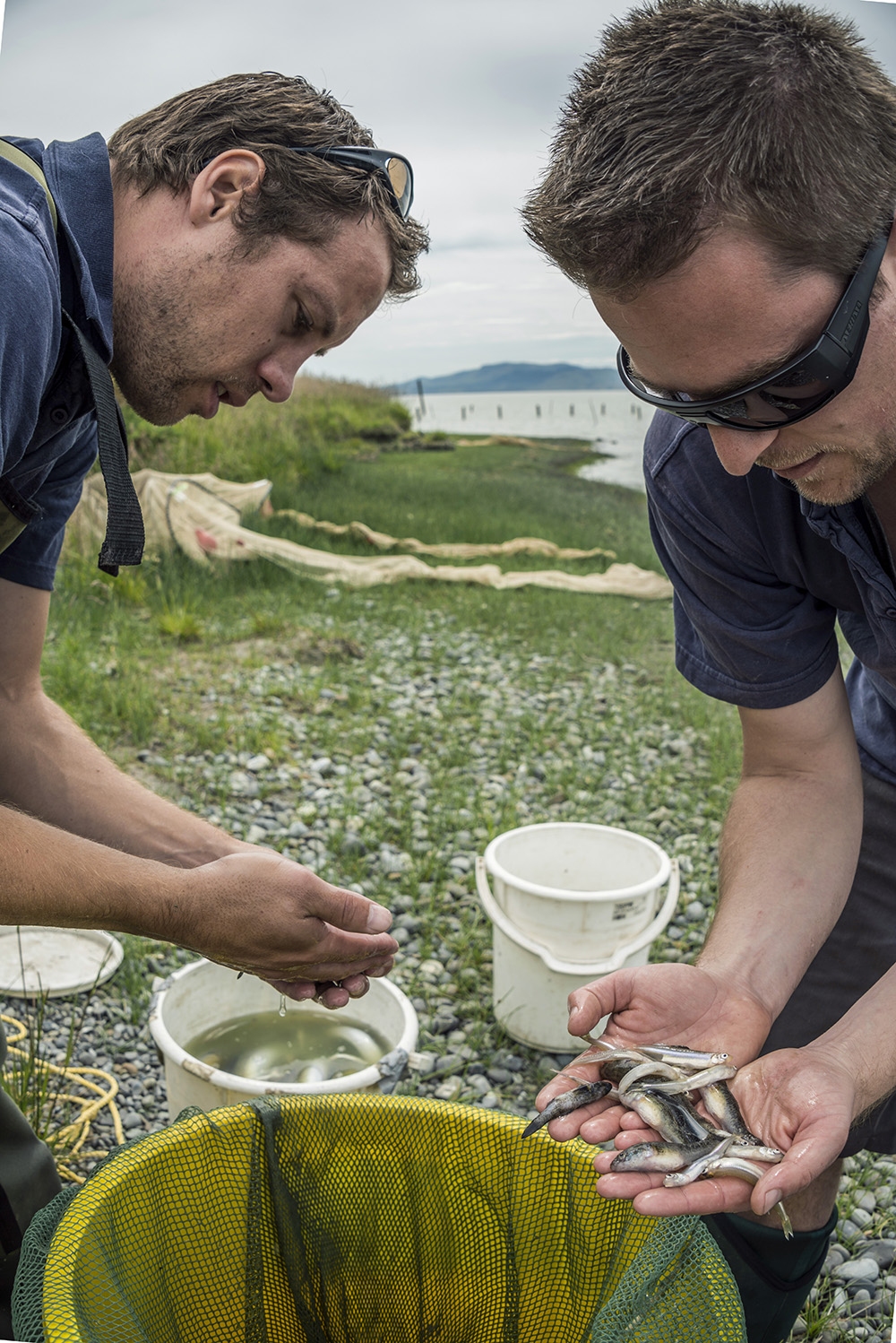 Dr. Phil Jellyman (left) and Dr. Shannan Crow (right) holding a by-catch of bullies and smelt with catches of longfin, shortfin eels and Te Waihora (Lake Ellesmere) in the background. This eel study is part of a multi-disciplinary research programme that is monitoring the benefits of macrophyte re-establishment in Te Waihora. Photograph by Dave Allen on 4 December 2014.