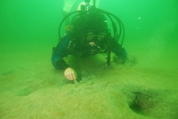 Eels can also live in holes made in the lake bed. In this picture a NIWA diver is inspecting a hole on the bottom of Lake Tutira (April 2010). Credit: Rohan Wells