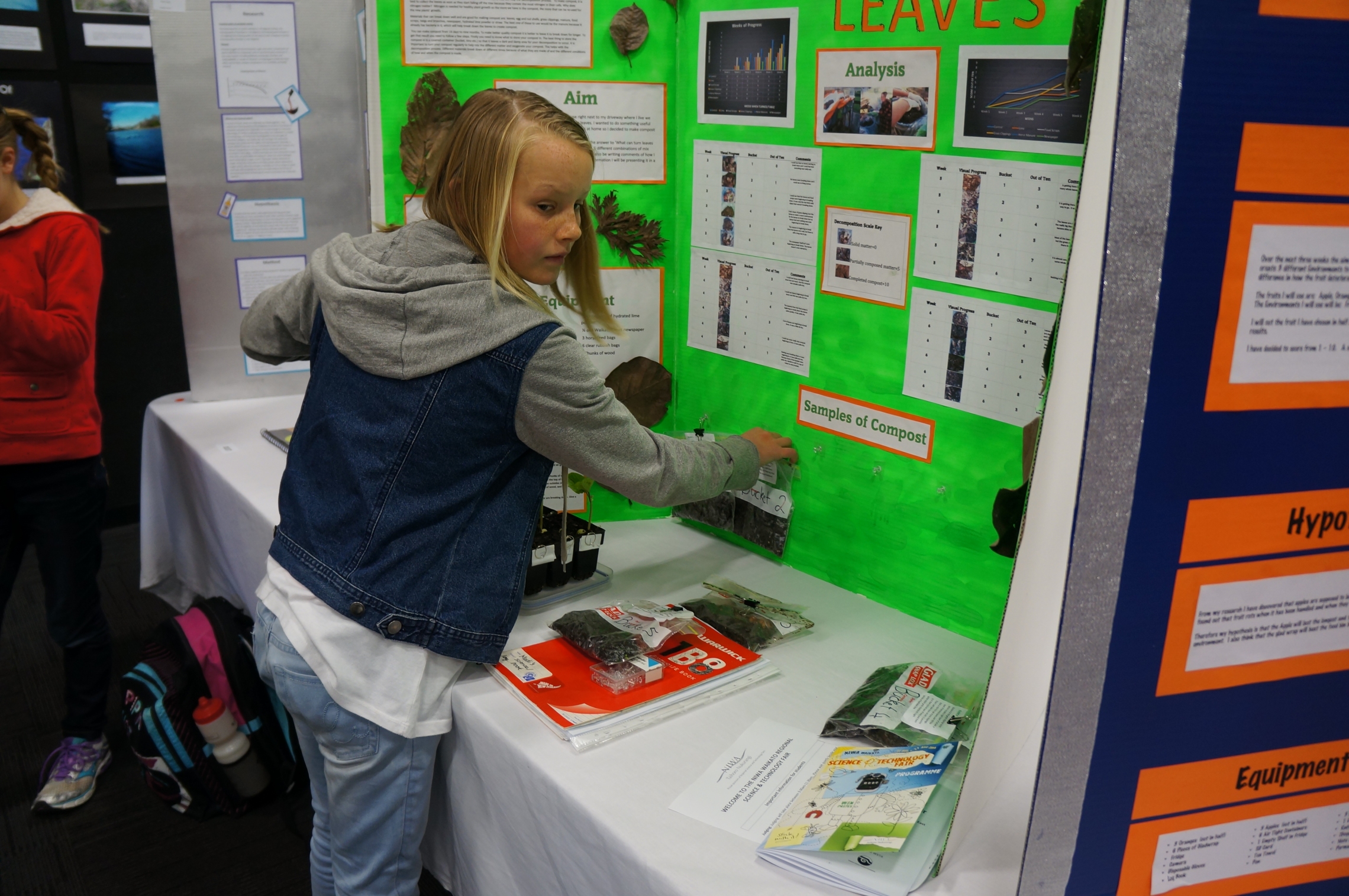 Madison Vankerkhoff setting up her project testing what can turn leaves into compost the fastest.