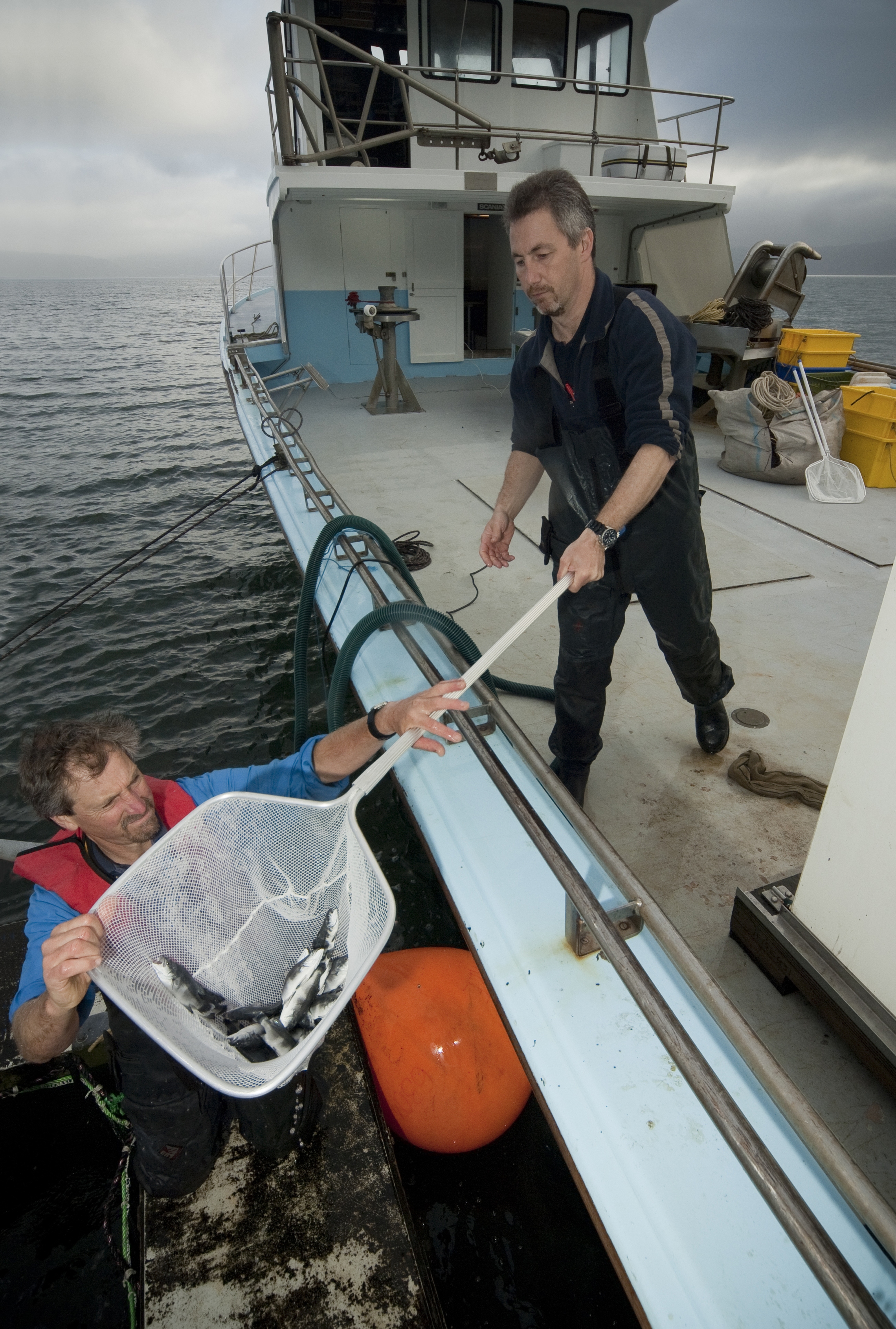 Graeme Moss and Philip Heath transferring juvenile Hapuku to the sea cages at Mahanga Bay. Photo taken on 3 February 2011 by Dave Allen, NIWA