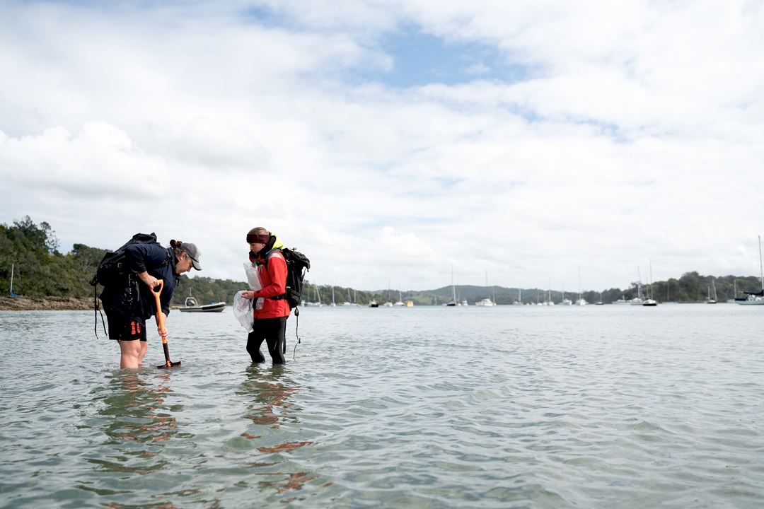 Sarah Hailes (left) and Kelly Carter taking biodiversity samples in the Mahurangi Estuary. More than 100 different species of worms have been found in the estuary mud.