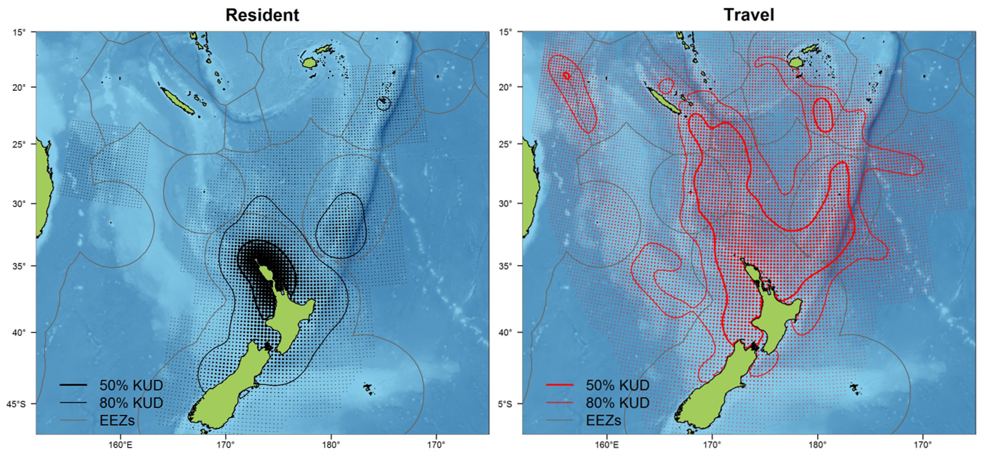 Maps showing the distribution of Resident (left) and Travel (right) behaviour. Contour lines are the 50% and 80% probability zones.