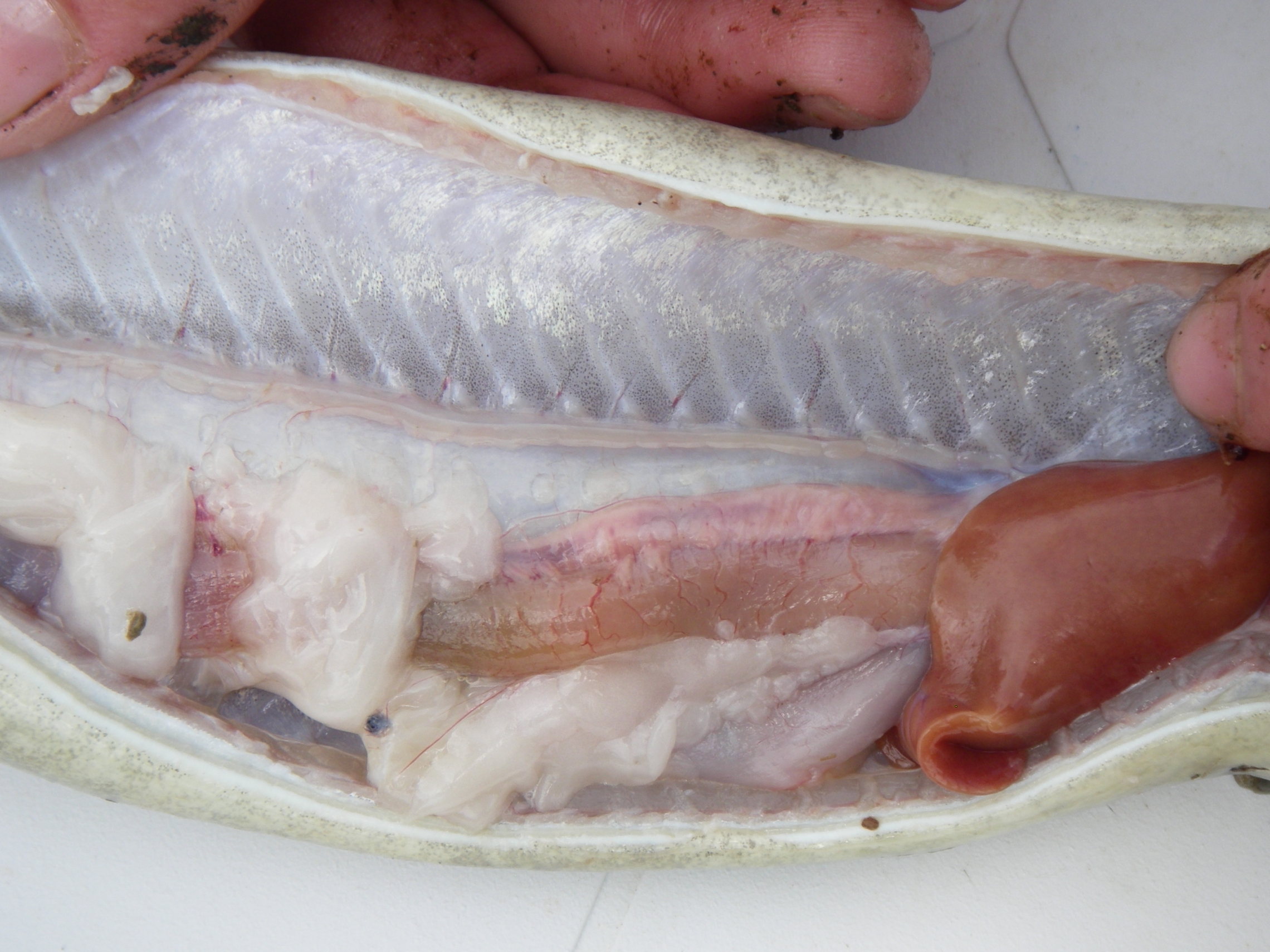 Example of a shortfin male gonad from Lake Ōmāpere. The lobed male gonad (or testes) runs along the backbone of the eel and looks a bit like a string of beads. Credit: Jacques Boubeé