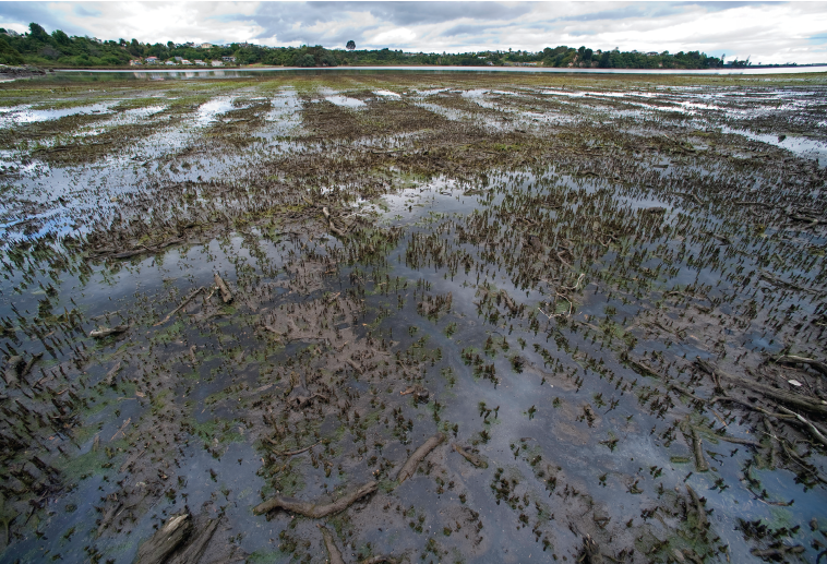 Detritus still marks the scene at Welcome Bay, on Tauranga Harbour, where mangroves were mulched in early 2011. Contrary to expectations that the mangrove debris would 'mobilise,' the tides failed to carry away the mulch, or the mud that supporters of the operation had hoped it would remove. In subsequent trials, the mechanical mulcher was followed by a beach groomer, which collected the slashed material. (Dave Hansford)