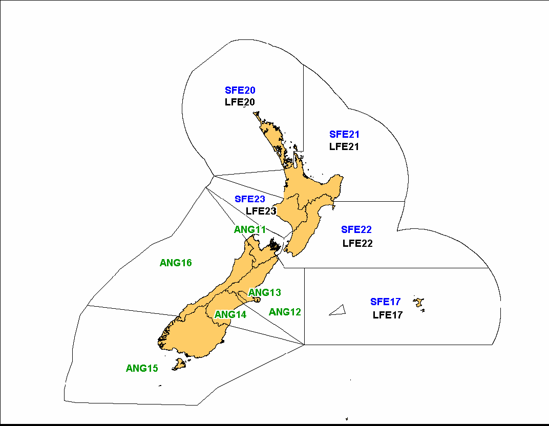 Map of stock management areas for commercially fished freshwater eels. LFE denotes longfin eels, SFE denotes both shortfin eels and Australian longfin eels. ANG is a combined code for longfin and shortfin eels (from MFish 2008).