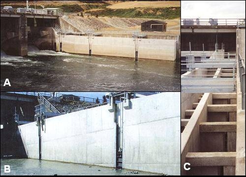 Mararoa Weir fish pass, Waiau River. (A) overall view from right bank; (B) gated entrances; (C) internal cells and slots. Credit: Jacques Boubée