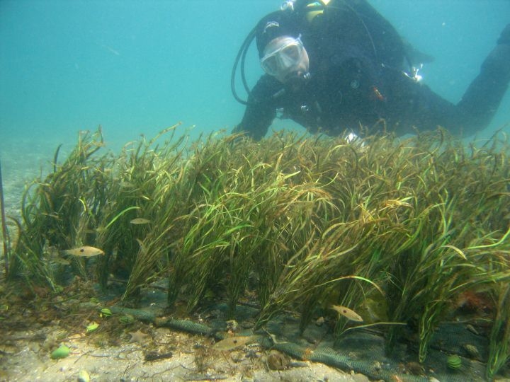 NIWA diver Matt Smith with one of the artificial seagrass beds