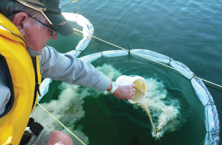 Sediment capping agents, such as this one, applied by NIWA Environmental Chemist Max Gibbs, work by encouraging particles to clump together, thereby locking nutrients into lakebed sediment, or neutralising them. Credit: NIWA