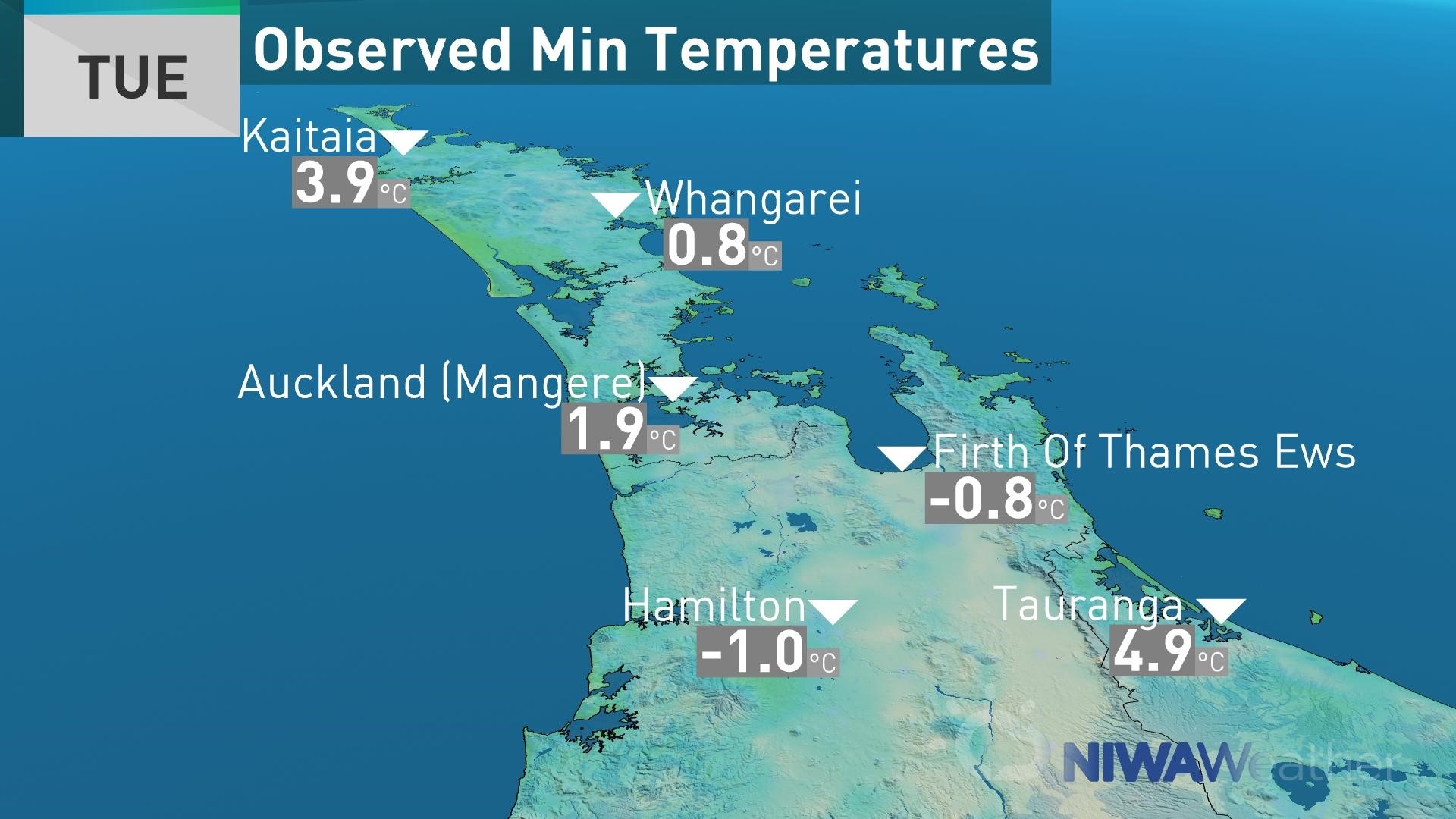 Minimum observed temperatures, northern North Island, Tuesday 29 May 2018.