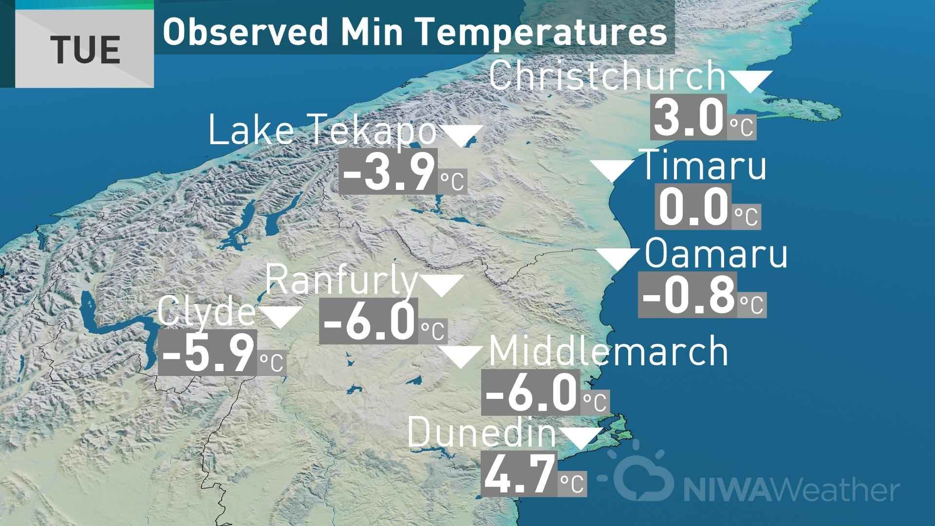 Minimum observed temperatures, Canterbury and Otago, Tuesday 29 May 2018.