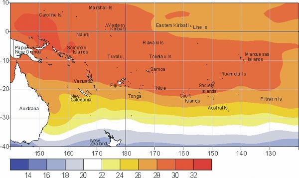 Mean sea surface temperatures (�C) for April 2004
