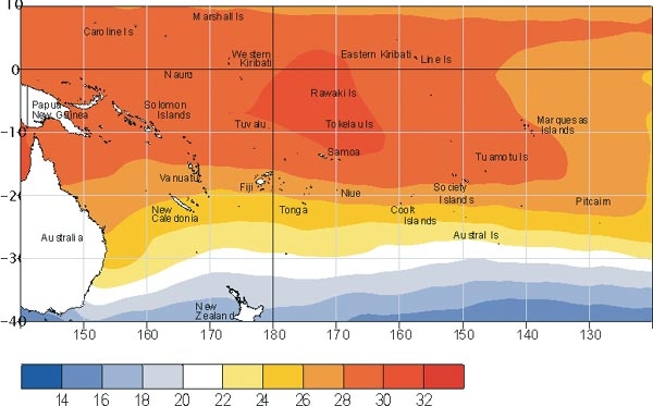 Mean sea surface temperatures (�C) for December 2002