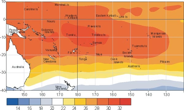 Mean sea surface temperatures (�C) for March 2003