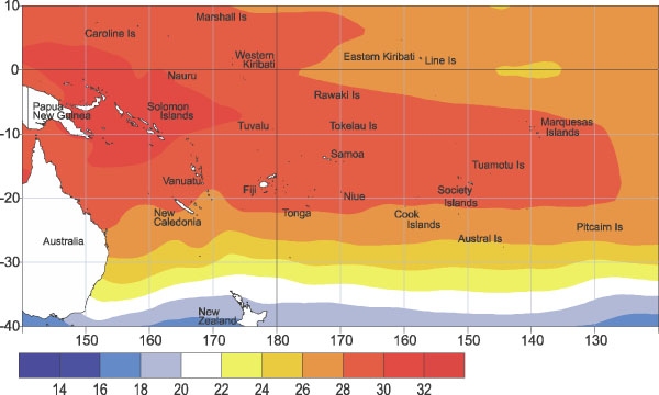 Mean sea surface temperatures (�C) for March 2004