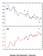 Mean total column ozone and noontime UV index at Lauder, New Zealand, for summers (December to February) from 1978/79 to 1999/2000.