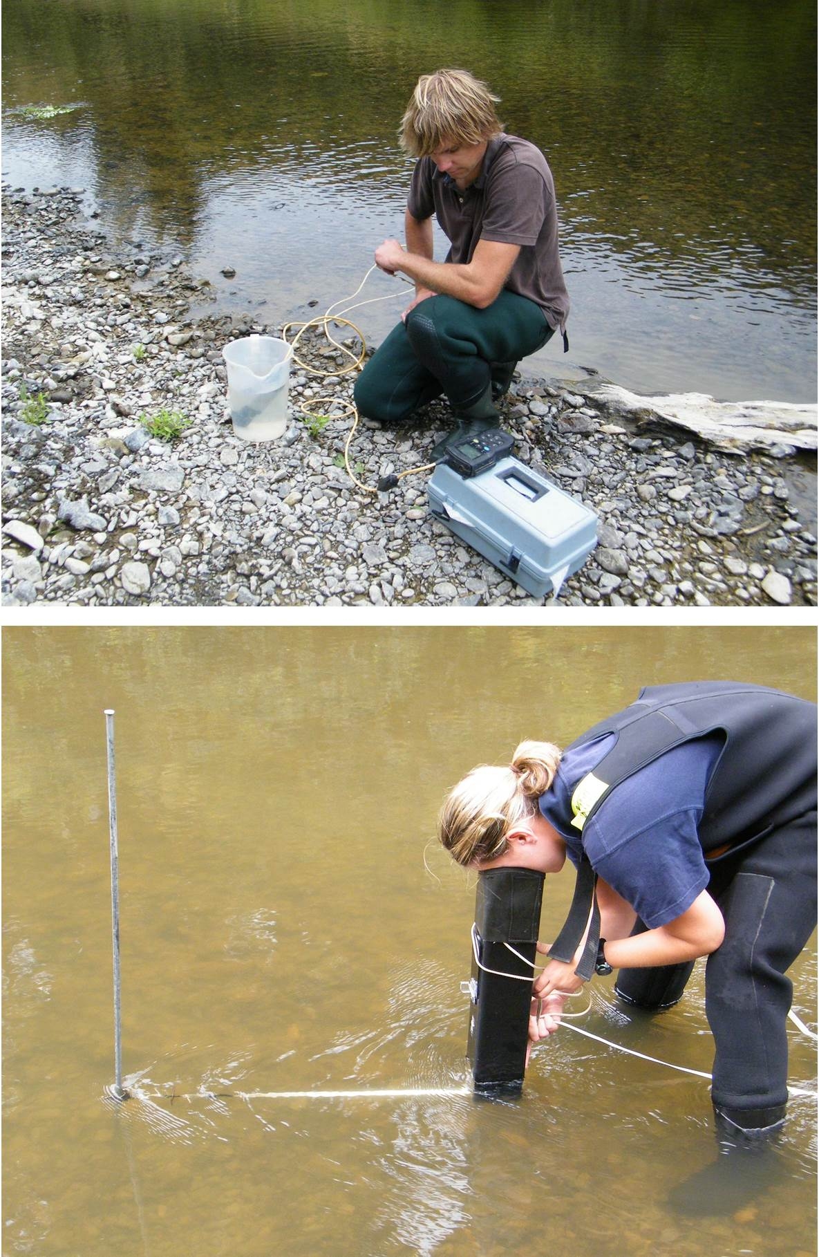 Top: Junior hydrology technician Jeremy Rutherford measures dissolved oxygen and water temperature in a river water sample. [Graham Timpany] Bottom: Visual water clarity is measured as the distance underwater one can see a black disc viewed horizontially using an underwater periscope.