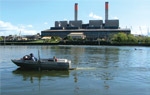 Measuring the Waikato River at Huntly. The ADCP is mounted mid-way down the side of the jet boat.
