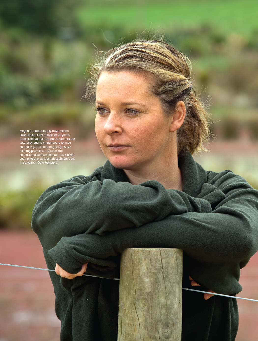 Megan Birchall’s family have milked cows beside Lake Ōkaro for 30 years. Concerned about nutrient runoff into the lake, they and five neighbours formed an action group, adopting progressive farming practices – such as the constructed wetland behind – that have seen phosphorus loss fall by 38 per cent in six years. Credit: Dave Hansford
