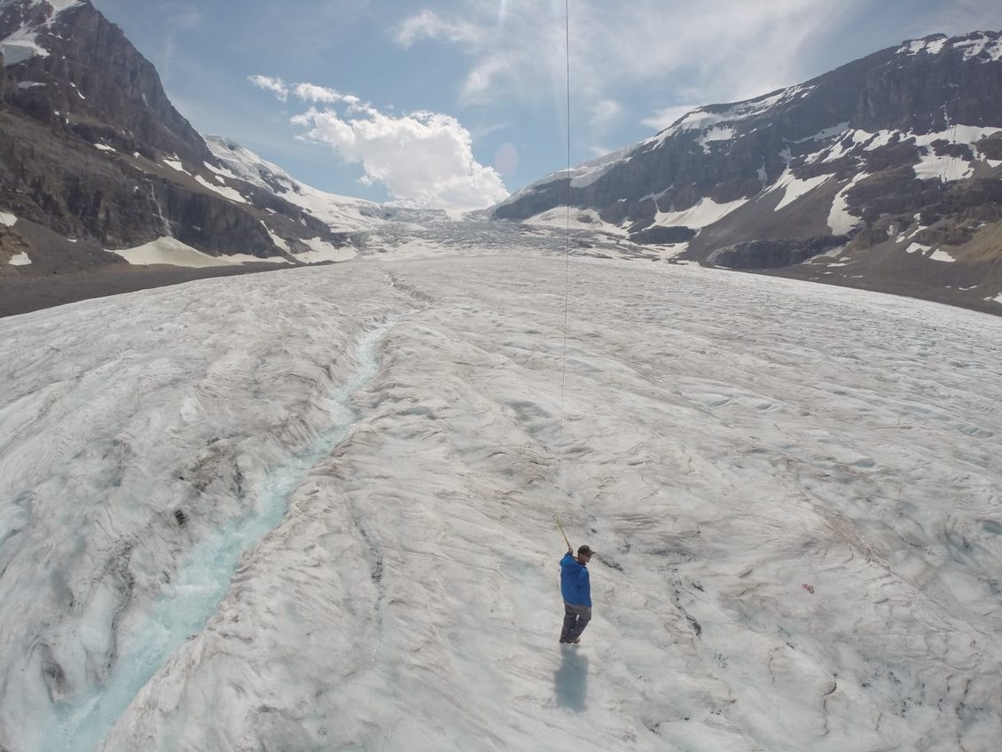 Melt water channel on Athabasca Glacier from kite-based air temperature profiling system.