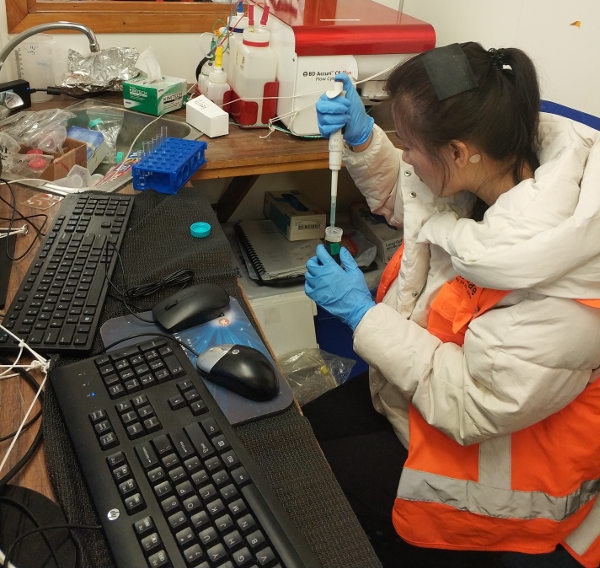 Chinese student Mengxiao Zhou prepares a sample of phytoplankton for the FlowCam.