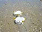 Mesh cages hold transplanted animals in place until they burrow back into the sediment.