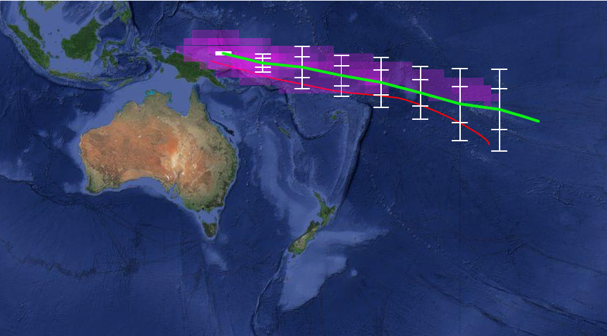 The ensemble of global climate models for rainfall that are used in METPI show an area of higher than normal rainfall associated with the SPCZ position. The green line indicates the average SPCZ position for the forecast period based on the average of eight climate models. The white vertical bars and ‘whiskers’ indicate the one and two standard deviations between the model projections of the SPCZ position every five degrees of longitude. The purple shading is proportional to the probability of intense convection developing within the SPCZ.