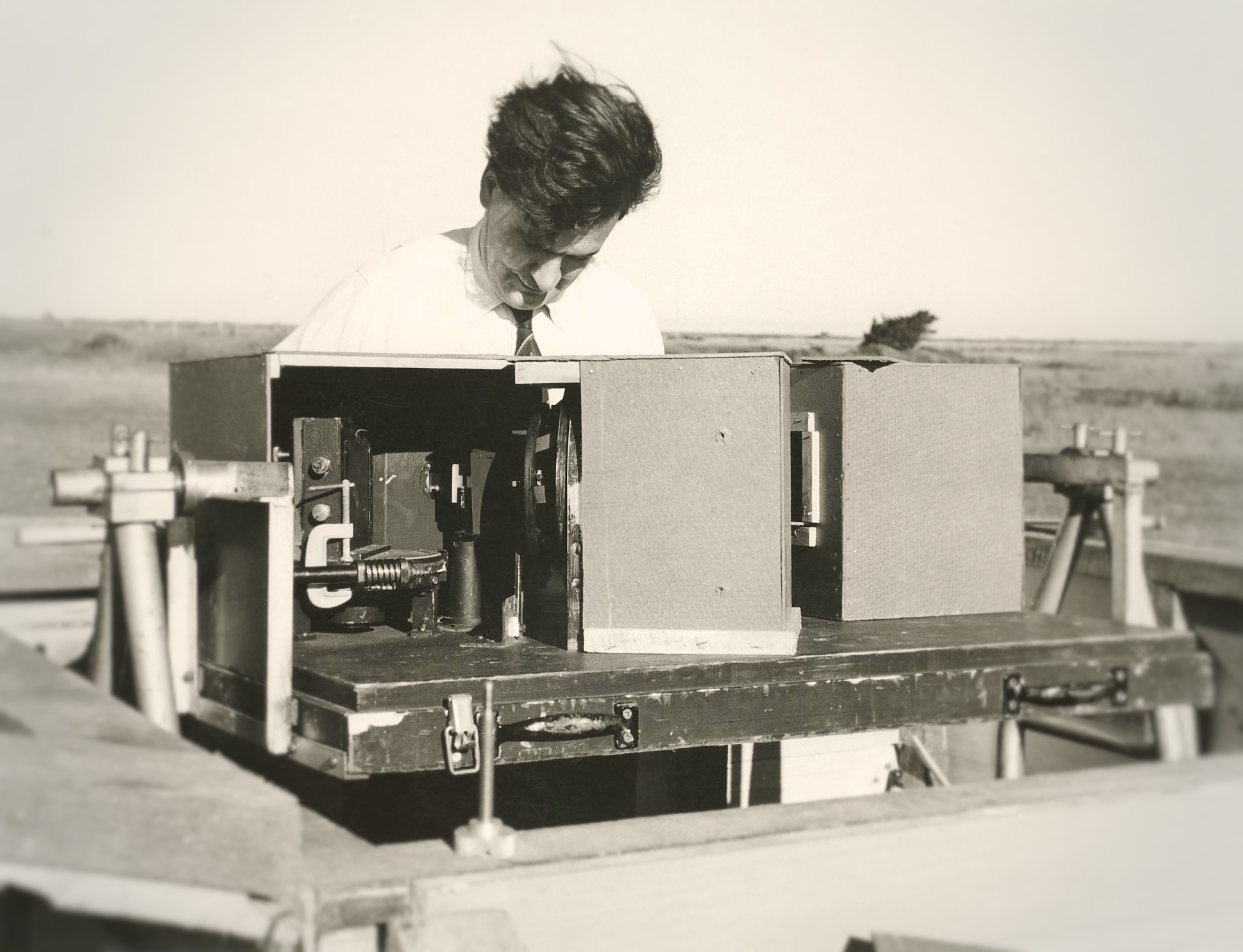 Auroral spectrograph. Dr Mike Gadsden adjusts a spectrometer used to identify different “excited” gases in the aurora. Mike Gadsden was an optics specialist.