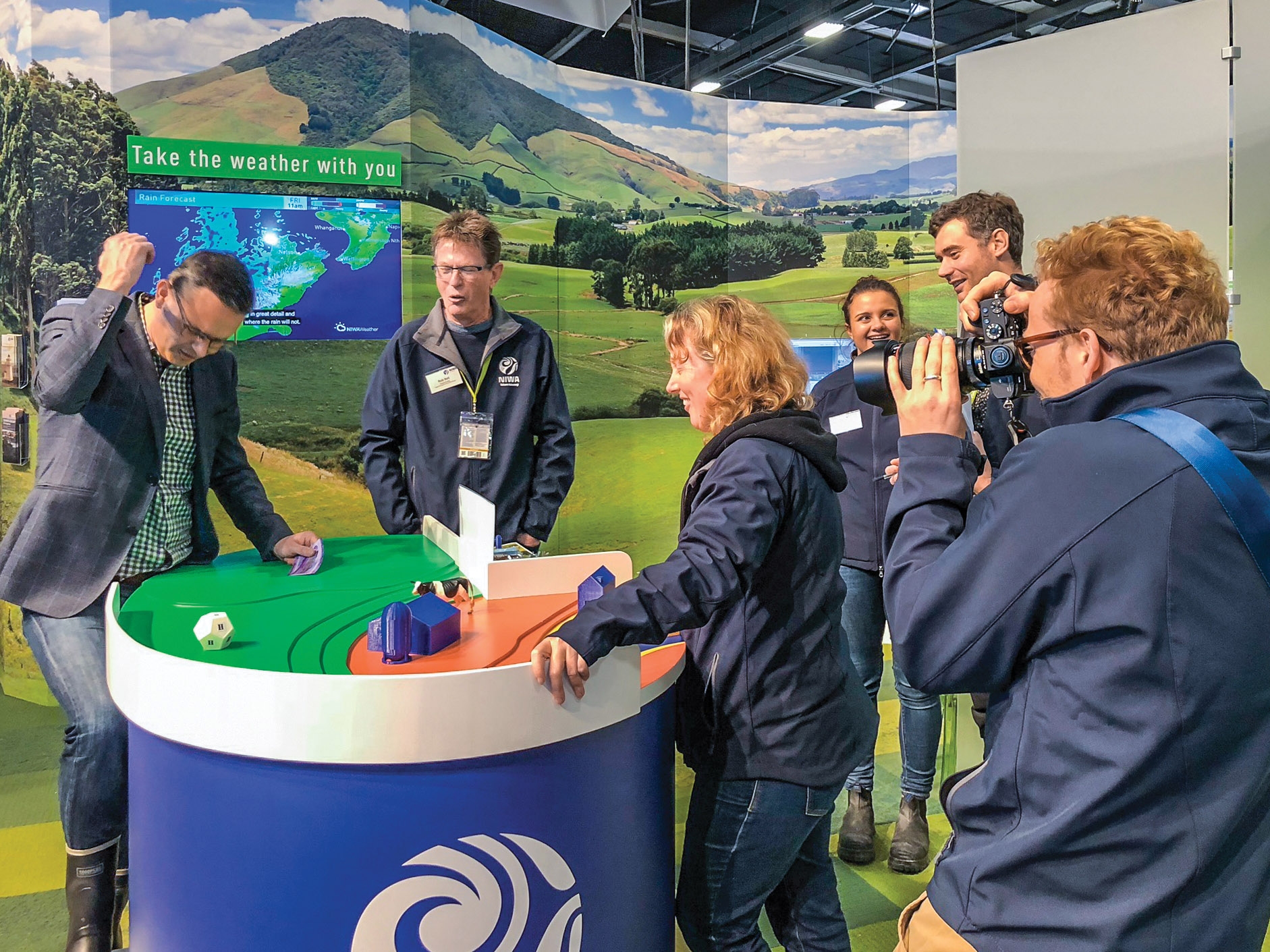 Climate Change Minister James Shaw plays the Climate Adaptation Challenge with NIWA's Rob Bell, Paula Blackett, Susie Elcock, Stephen Fitzherbert and Stu Mackay looking on.