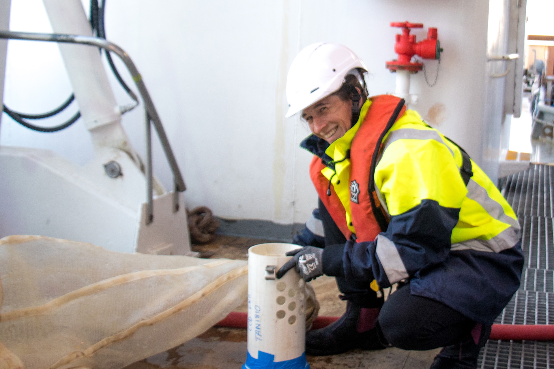 Voyage leader Dr Moira Décima opening the cod-end from the first plankton tow searching for salps.
