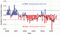 Monthly values of the Southern Oscillation Index (SOI), a measure of the changes in atmospheric pressure across the Pacific, and the 3-month mean (black line). Current values: August -0.9; JJA 3-month mean -0.2.