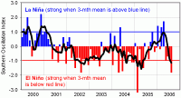 Monthly values of the Southern Oscillation Index (SOI), a measure of the changes in atmospheric pressures across the Pacific, and the three-month mean (black line). The SOI has remained consistently negative the past 3 months, with a value of -1.8 for Aug